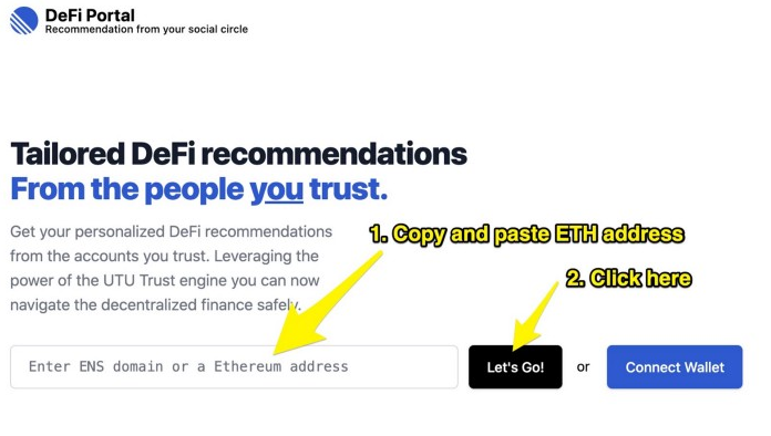 - Copy and paste your Ethereum wallet address in the field labeled “Enter ENS domain or a Ethereum address” and click the “Let’s Go!” button. Note: Entering an ENS domain or connecting a wallet does not work at the moment.