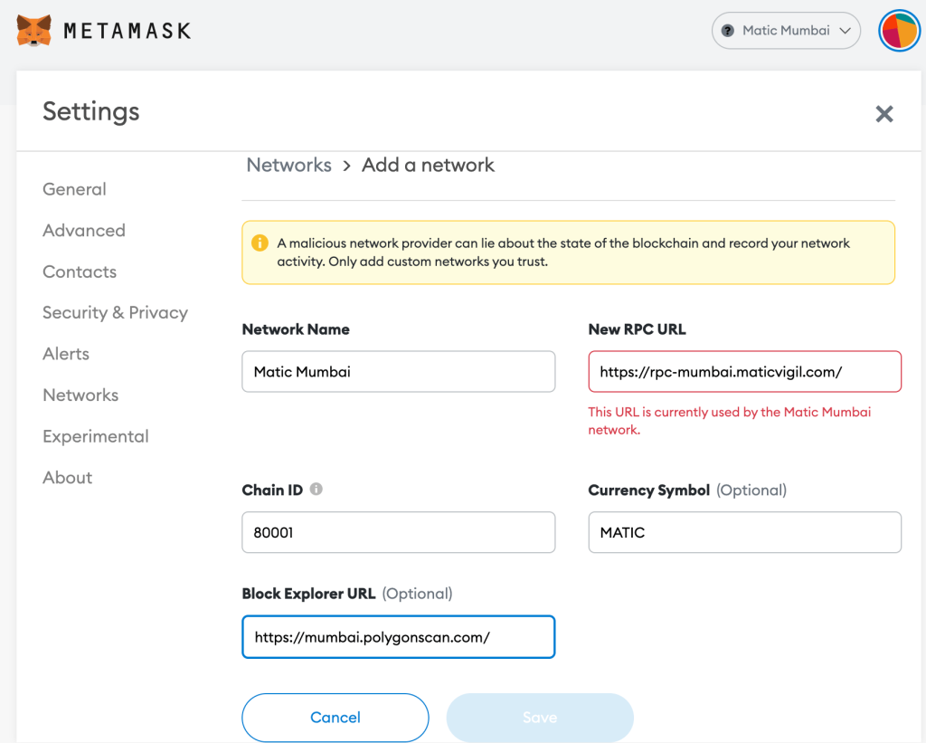 Click Save. You have now connected your MetaMask wallet to Polygon Mumbai testnet!